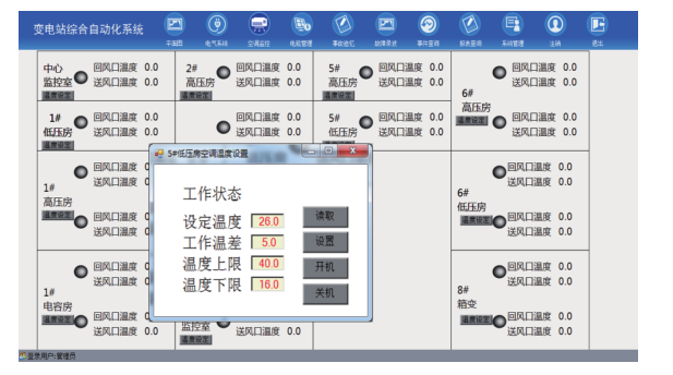 系統(tǒng)提供多種擴展接口,如各配電室里面的空調監(jiān)控,可通過對各高、低壓配電房、監(jiān)控室等回風口、送風口溫度的實時數(shù)據(jù)采集與監(jiān)測分析,為各空調機組的合理使用提供了數(shù)據(jù)依據(jù),并可進行遠程開關機及溫度的設定