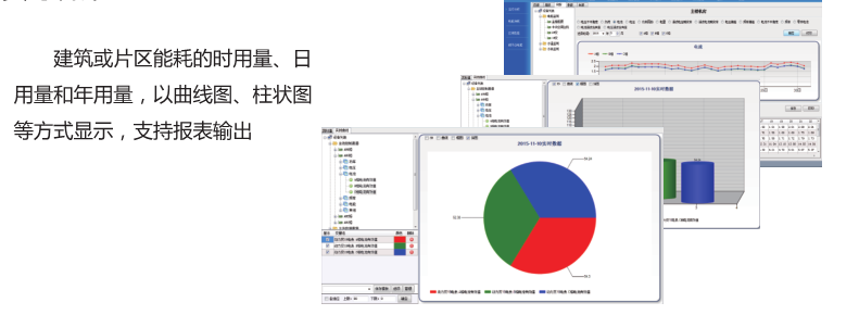 6、實(shí)時(shí)統(tǒng)計(jì)建筑或片區(qū)能耗的時(shí)用量、日用量和年用量,以曲線圖、柱狀圖等方式顯示,支持報(bào)表輸出