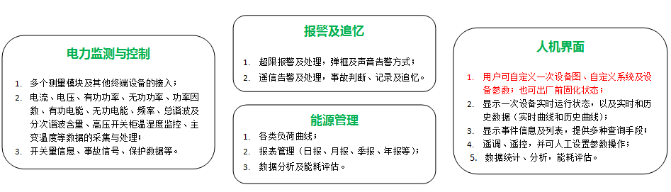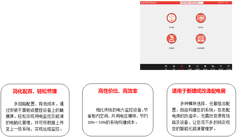 將各類模塊的信息,通過RS485線集中到管理系統(tǒng),輕松實現(xiàn)用電監(jiān)控及能源管理,為您提供節(jié)能降耗的有效解決方案,并可將數(shù)據(jù)上傳至上一級管理系統(tǒng)。安裝方式:可嵌入在面板門上集中顯示,適用于新站或老站改造;可壁掛式固定在配電房或值班室內,自帶打印、UPS不間斷電源,適用于老站改造。